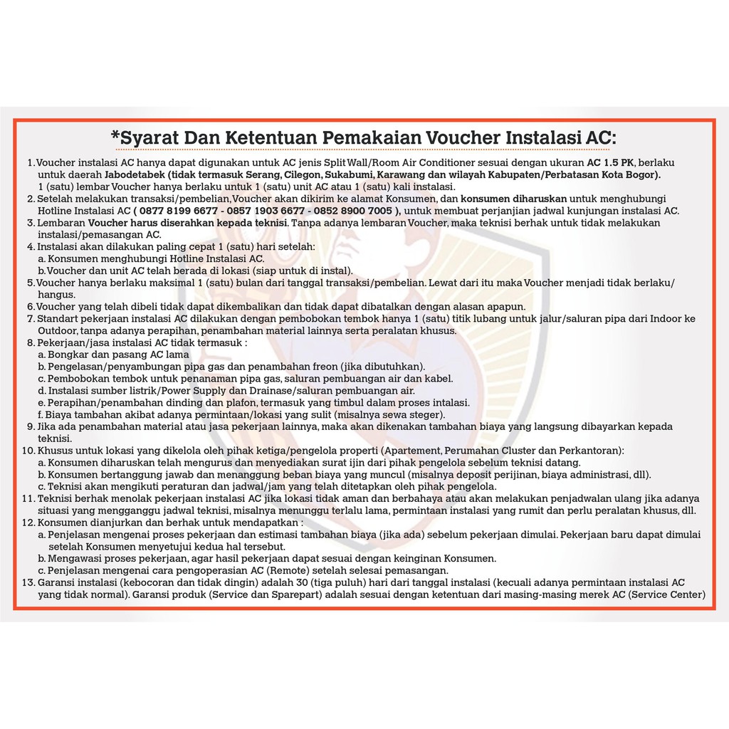 1. Voucher instalasi AC hanya dapat digunakan untuk AC jenis Split Wall/Room Air Conditioner sesuai dengan ukuran AC 1.5 PK, berlaku untuk daerah Jabodetabek (tidak termasuk Serang, Cilegon, Sukabumi, Karawang dan wilayah Kabupaten/Perbatasan Kota Bogor). 1 (satu) lembar Voucher hanya berlaku untuk 1 (satu) unit AC atau 1 (satu) kali instalasi.