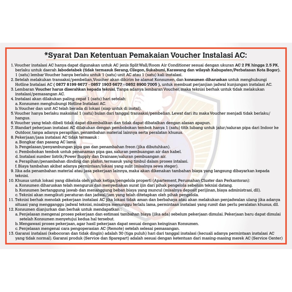 1. Voucher instalasi AC hanya dapat digunakan untuk AC jenis Split Wall/Room Air Conditioner sesuai dengan ukuran AC 2 PK Hingga 2.5 PK, berlaku untuk daerah Jabodetabek (tidak termasuk Serang, Cilegon, Sukabumi, Karawang dan wilayah Kabupaten/Perbatasan Kota Bogor). 1 (satu) lembar Voucher hanya berlaku untuk 1 (satu) unit AC atau 1 (satu) kali instalasi.