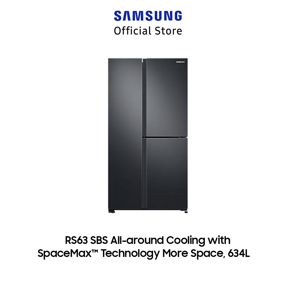 Samsung RS63 Side by Side memiliki SpaceMax� Technology dengan desain di dalam yang lebih ramping sehingga berkapasitas 689L. Tidak hanya itu, kulkas ini menawarkan teknologi All-around Cooling untuk menjaga kualitas seluruh bahan makanan yang ada simpan di kulkas tersebut. Dengan desain 3 pintu yang terdiri dari dua fridges dan satu freezer akan memaksimalkan pendinginan sehingga anda bisa menghemat energi dan makanan anda tersimpan dengan rapi. Dilengkapi pula dengan EZ Slide Shelf yang memudahkan anda menyimpan dan bahan makanan tanpa harus mengeluarkan seluruh isinya. Anda juga dapat membuat es di dalam kulkas ini dengan Slim Indoor Ice Maker.